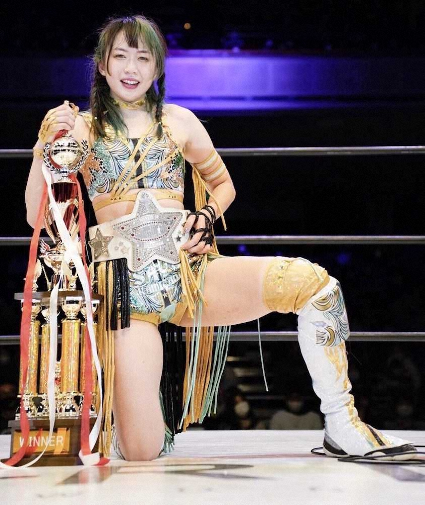 さらに2021年のシンデレラ・トーナメント初優勝を足がかりに、12月の両国国技館で中野たむ選手を破り“白いベルト”(ワンダー王座)を初戴冠――エース街道を一気に駆け上がった。