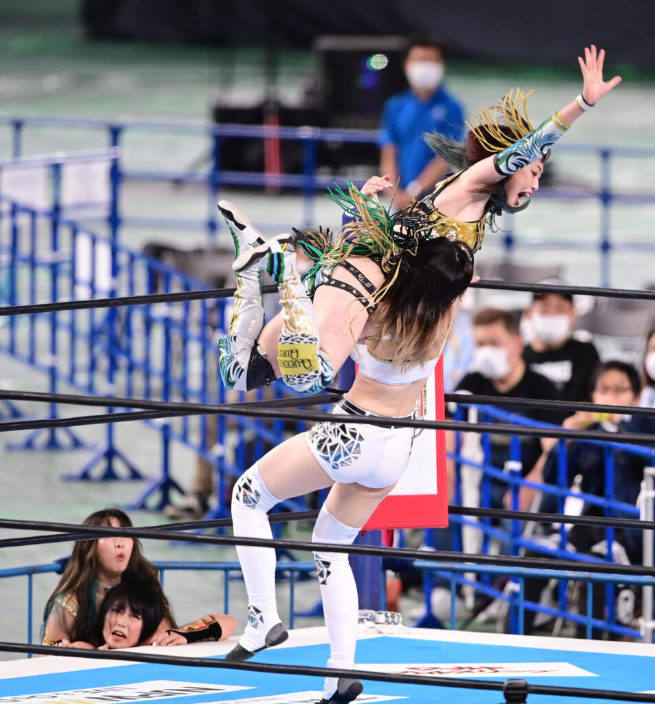 上谷選手はEXILEのサポートダンサーやバイトAKBなどを経て、2019年にスターダムでプロレスデビュー。この世界に誘ったのは、中野たむ選手だった(現在は引退)。身体能力の高さで早くから注目を集め、同年の新人王を獲得する。